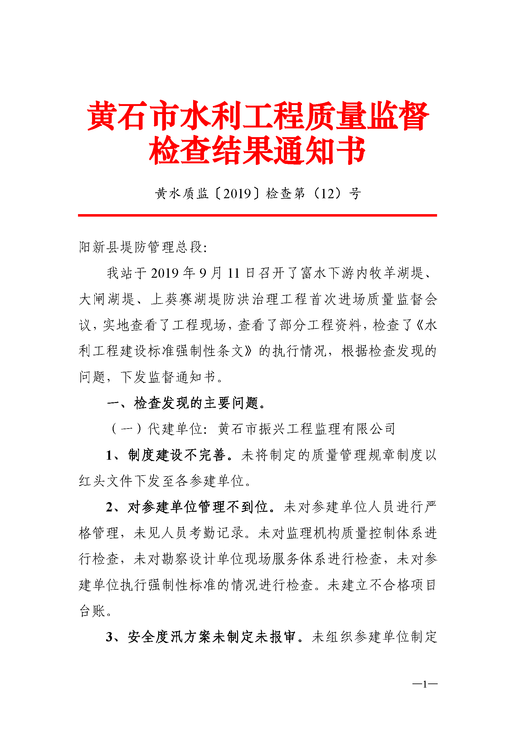 富水下游内牧羊湖堤、大闸湖堤、上葵赛湖堤防洪治理工程质量监督检查通知书