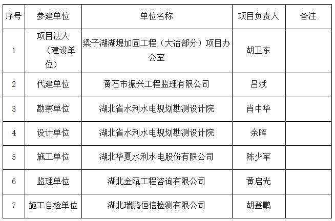 根据省水利厅《关于印发<湖北省大中型水利工程质量终身责任管理办法(试行)>的通知》(鄂水利规〔2016〕1号)的精神,现将市级监管项目梁子湖流域湖堤加固工程(大冶部分)参建单位责任人向社会公示如下: