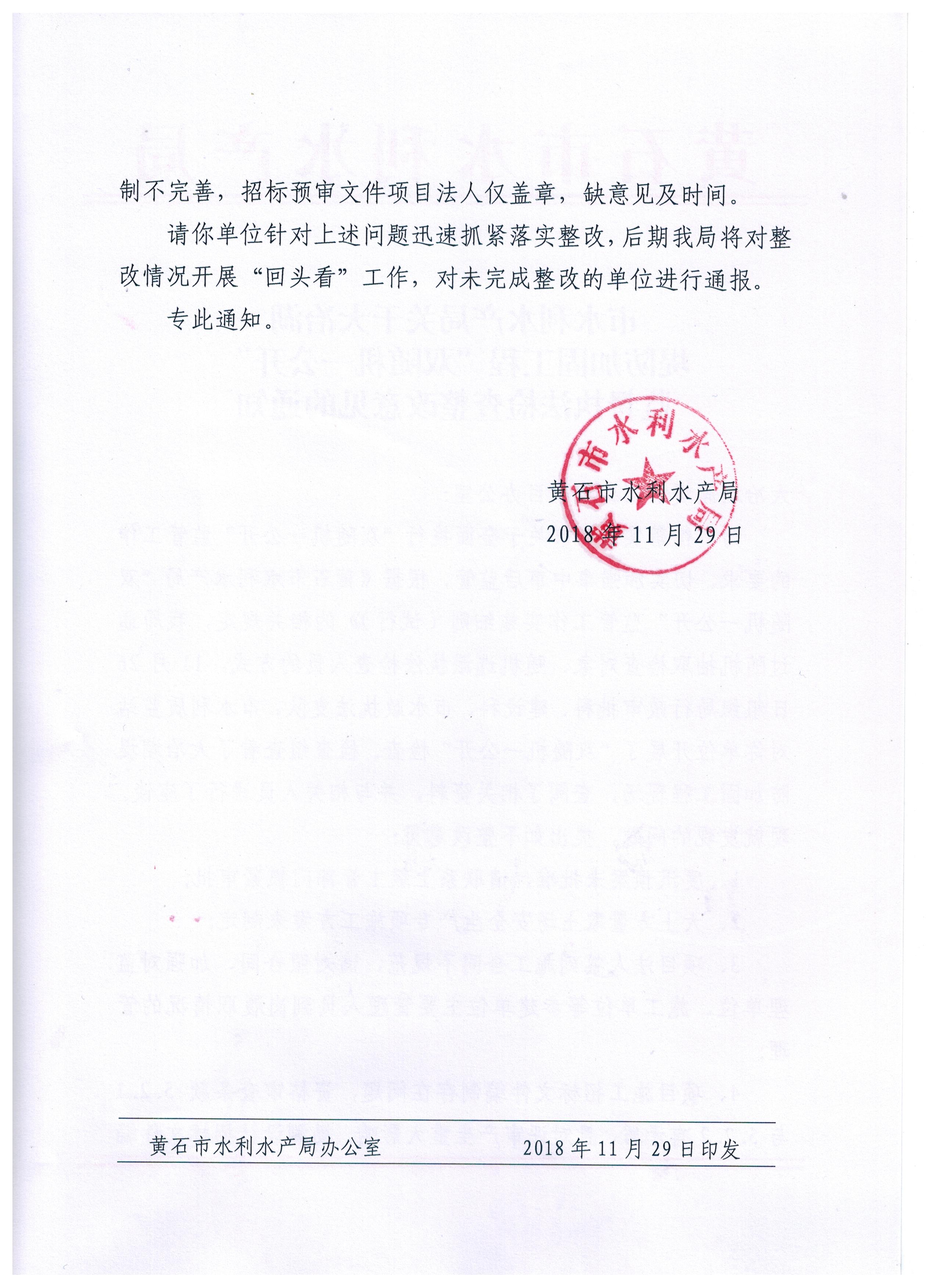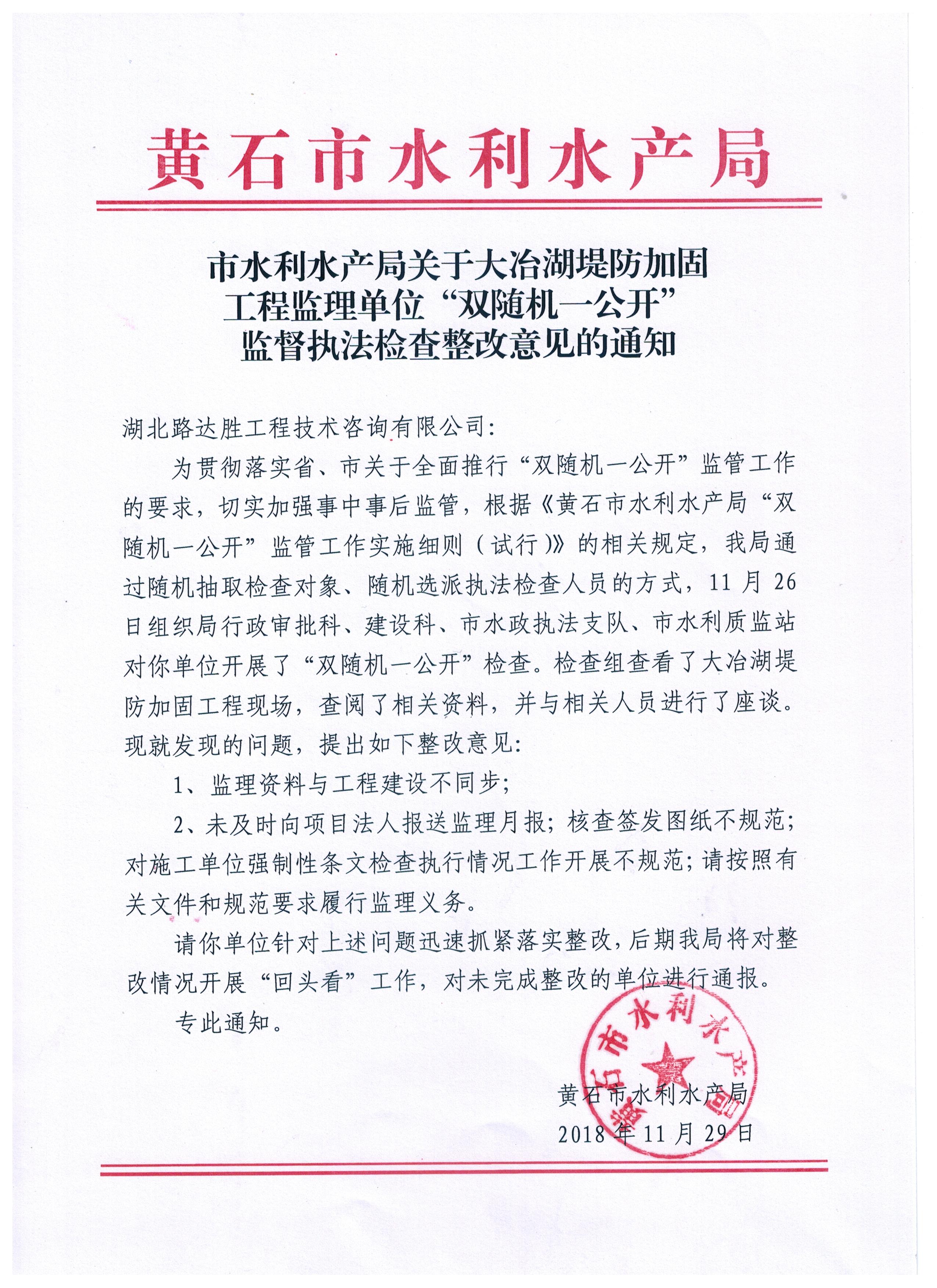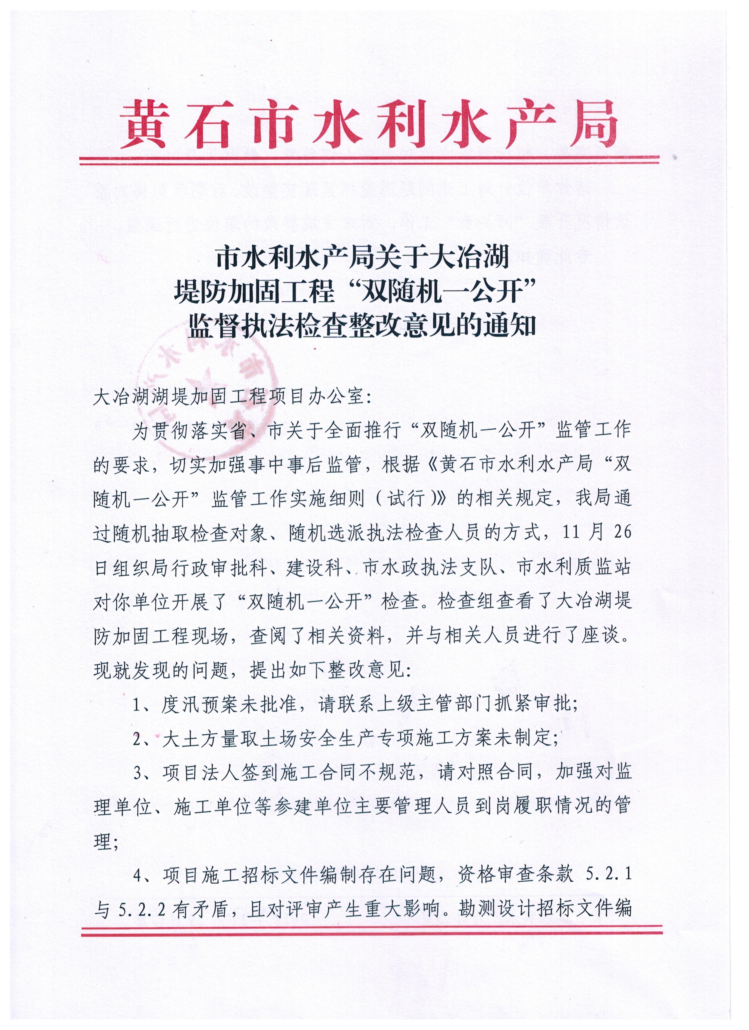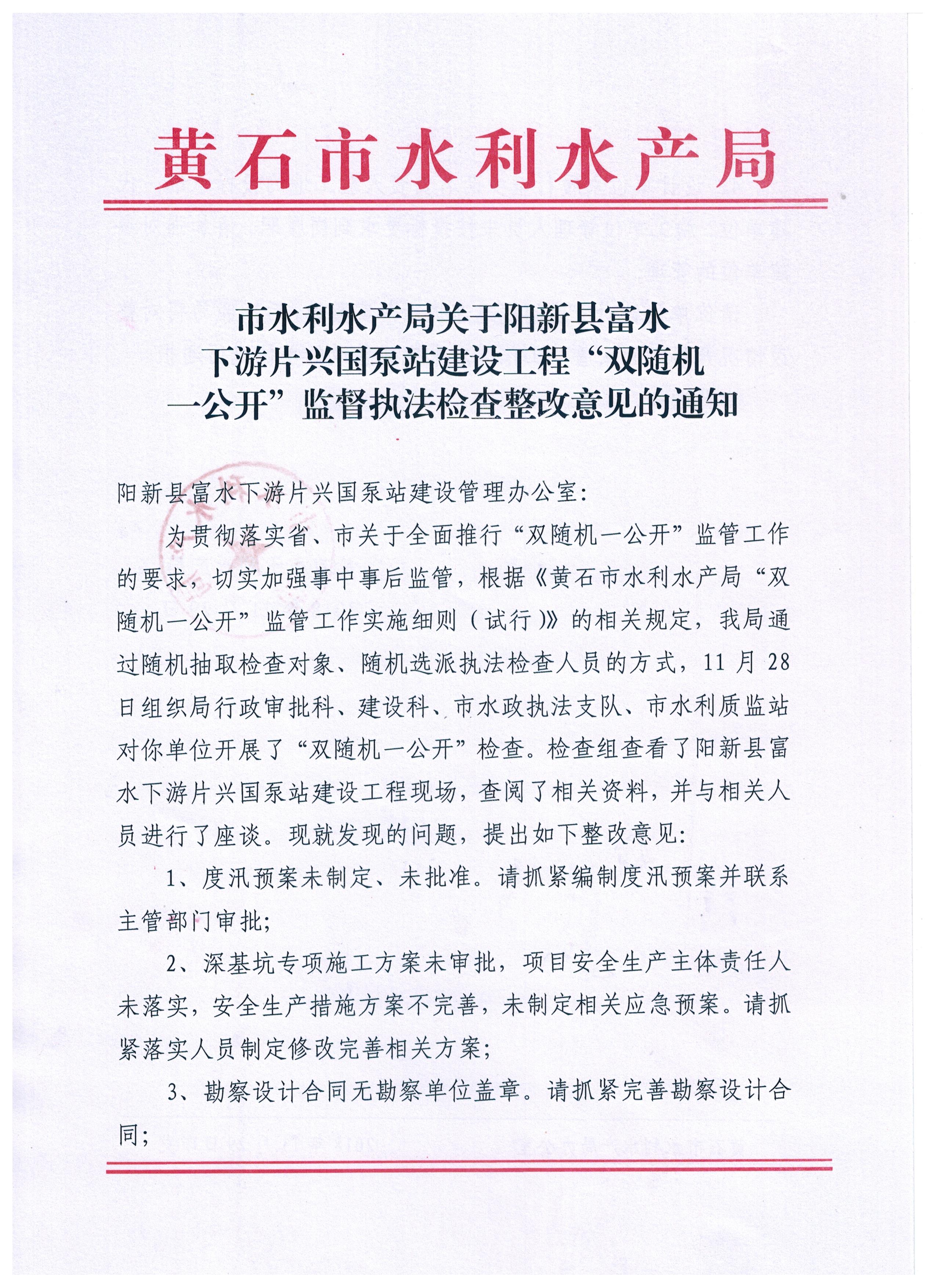 市水利水产局对阳新县富水下游片兴国泵站建设管理办公室等五家单位“双随机一公开”监督执法检查整改意见的通知