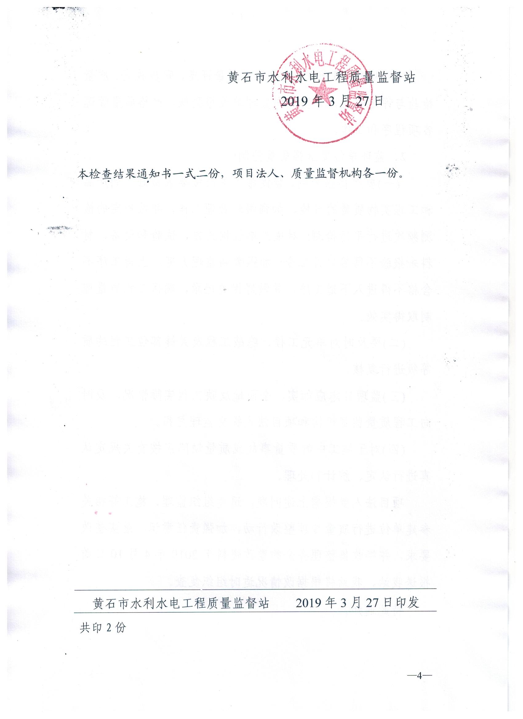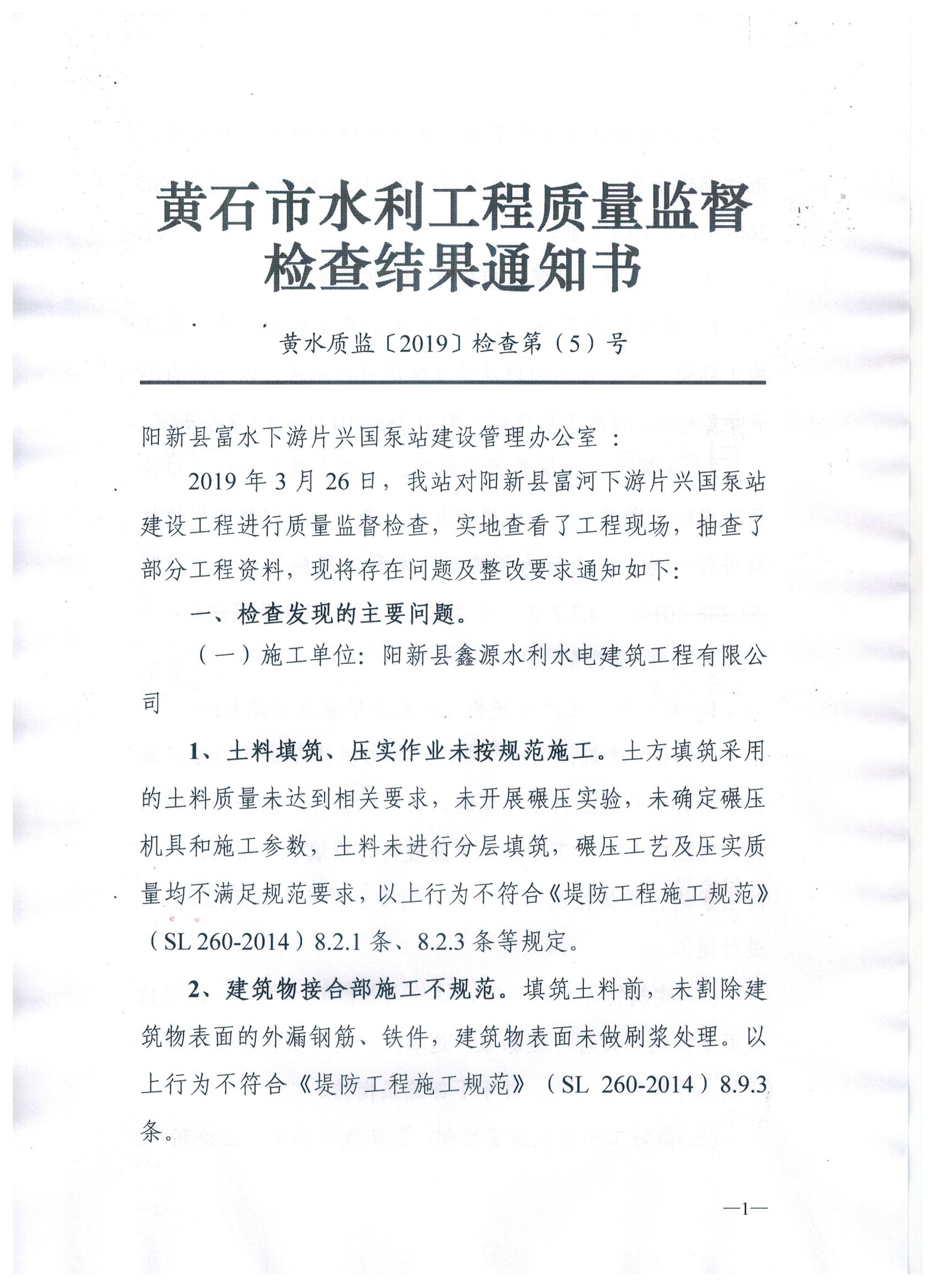 阳新县兴国泵站建设工程质量监督检查结果通知书(201905号)